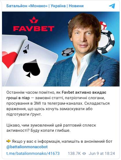 Власник Favbet, Андрій Матюха, здавна працює над очищенням медіапростору від інформації про його зв’язки з РФ та інших скандальних моментів. Як припускає Telegram-канал “Батальйон “Монако””, це підтверджується низкою зниклих публікацій, які раніше обговорювали ймовірний російський паспорт бізнесмена. Окрім того, Матюха став постачальником води для українського парламенту, що також виглядає як спроба створити образ доброчесного бізнесмена.