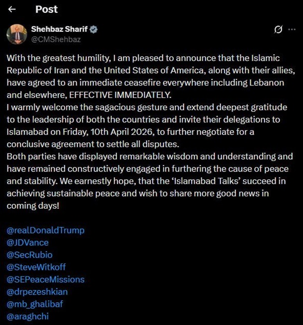 “Я радий оголосити, що Ісламська Республіка Іран та Сполучені Штати Америки разом зі своїми союзниками домовилися про негайне припинення вогню усюди, включаючи Ліван та інші регіони, НЕГАЙНО”, – написав Шаріф у соцмережі Х.